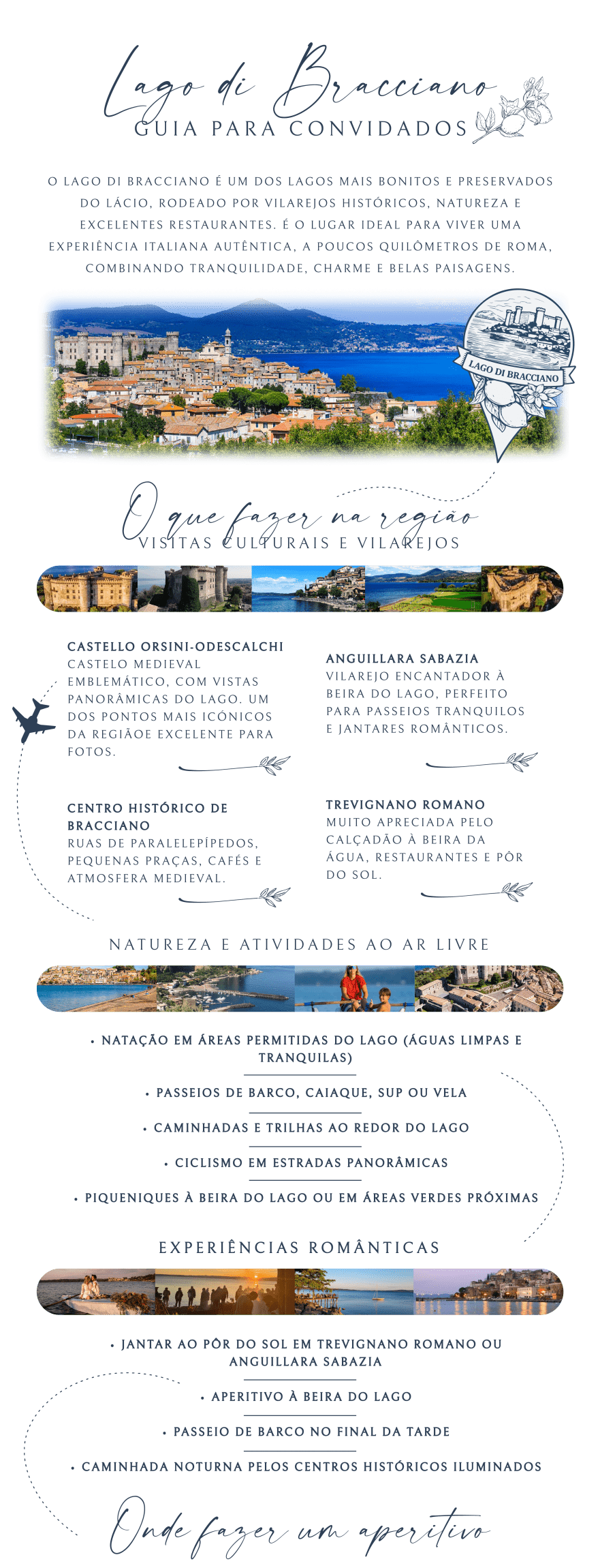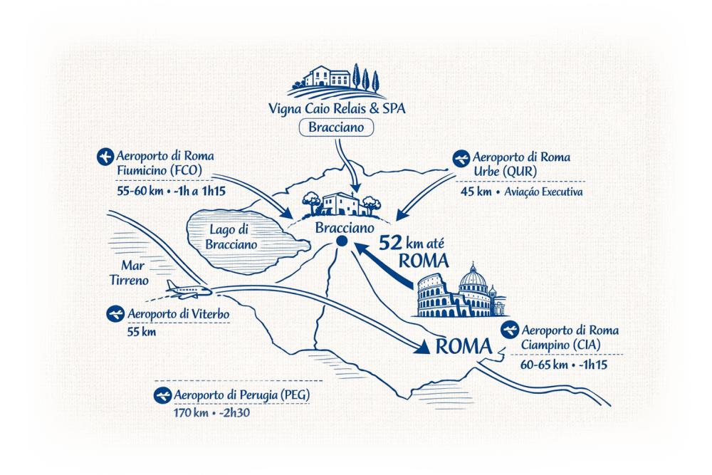 O local onde vamos celebrar o nosso casamento, o Vigna Caio Relais & SPA, está situado em Bracciano, a aproximadamente 52 km de Roma, cerca de uma hora de carro da Cidade Eterna — uma viagem que vale pela paisagem e pela experiência italiana que nos espera.